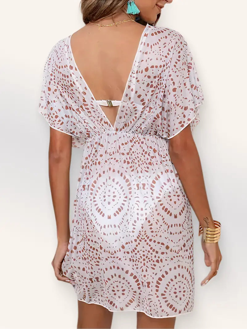 The dress-style cover-up is offered in multiple sizes; consult garment measurements in the size chart to choose an accurate fit.