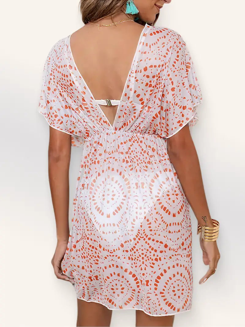 This piece features an allover print with fluttering butterfly sleeves and a breezy dress silhouette for more torso and hip coverage.