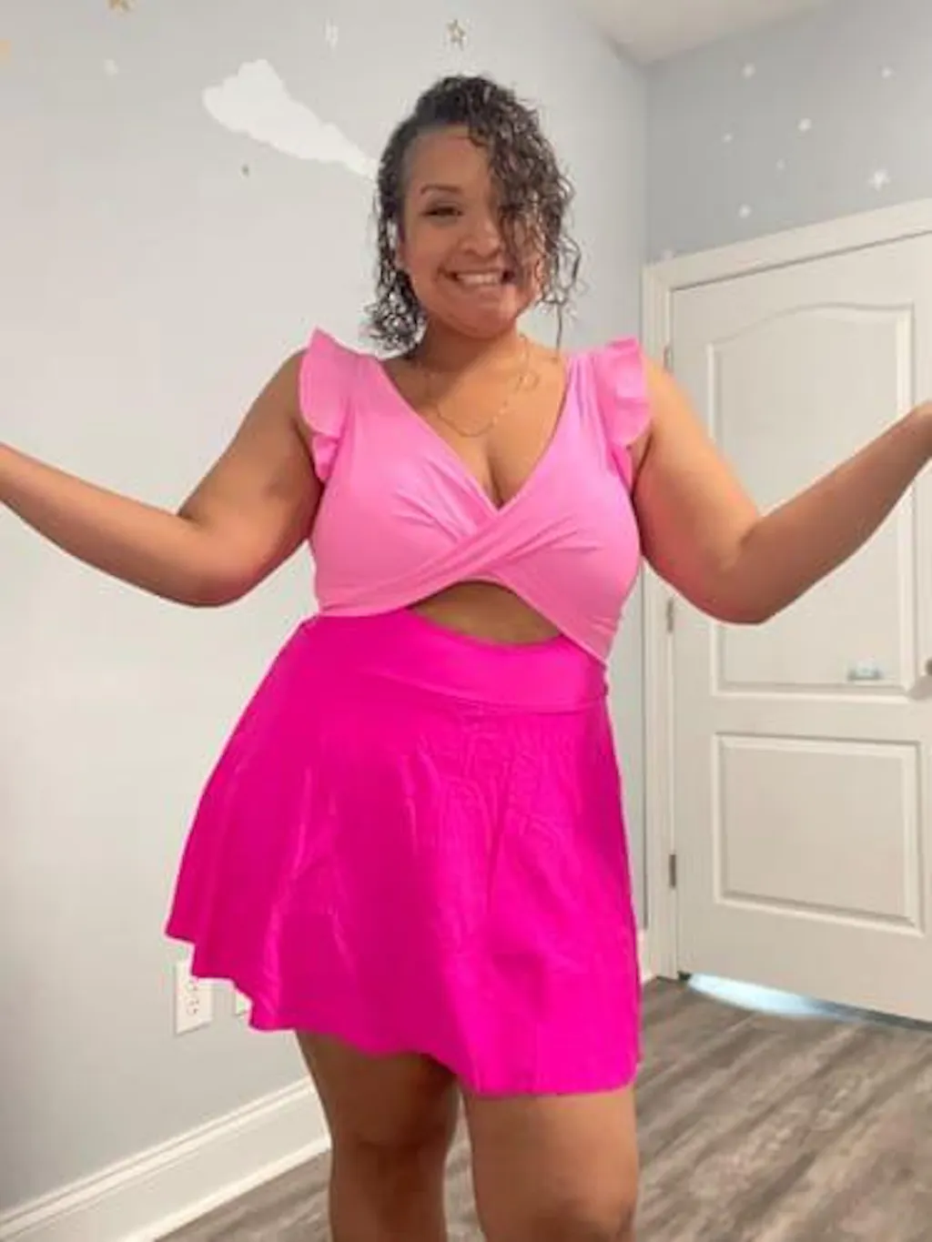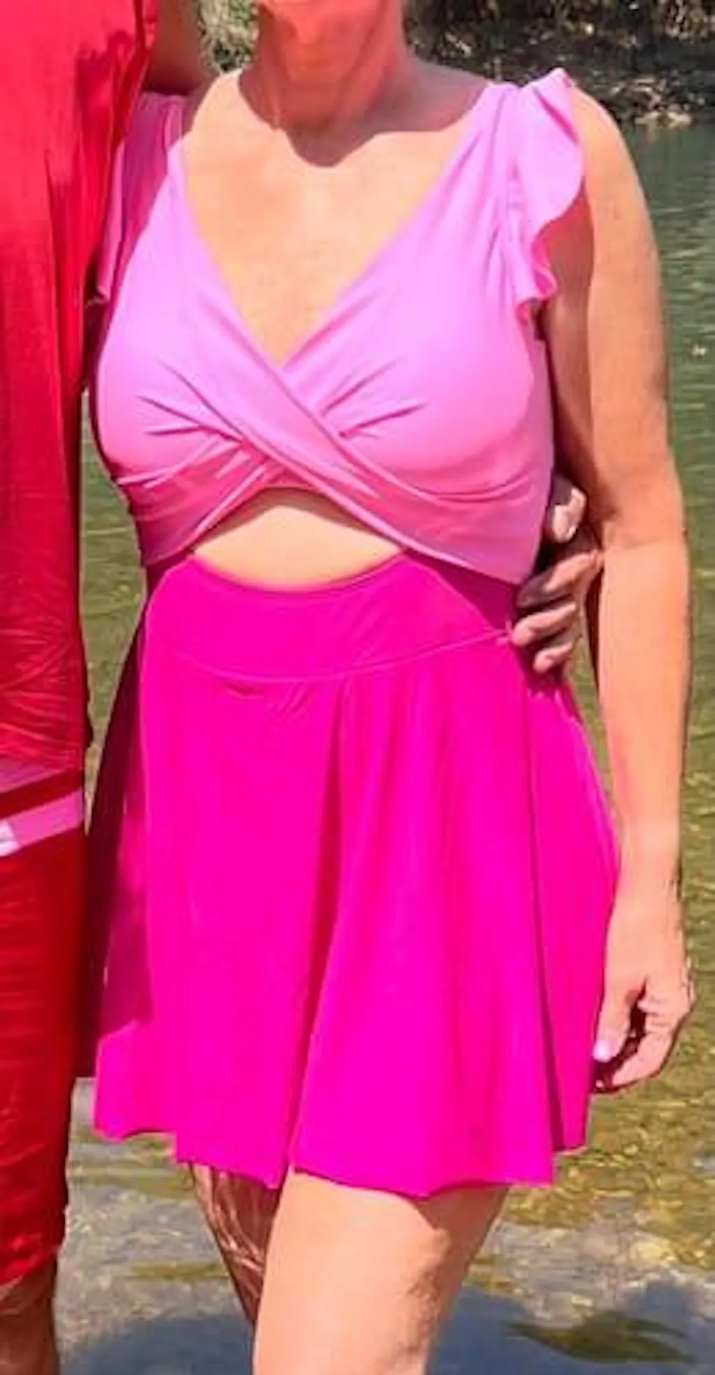 This bathing suit is so beautiful and I just want to wear it everywhere all summer long. The fabric is fabulous. It tries so quickly after getting wet. I will also say that it covers all of my self-conscious areas. The color is a lot brighter than I thought it would be But that's OK with me. I love Barbie pink. I got a large and I'm between a size 10 and 12 and it fits really nicely. I am 5 foot two and it's a bit long on me. It goes a little bit past my mid thigh closer to my knees. So it's going to be very modest for us shorter gals. I've thought about cutting it a little bit shorter but honestly it's fine especially since I go to a lot of splash pads with my kid and I can really use it anywhere if I wanted to because it is so modest.